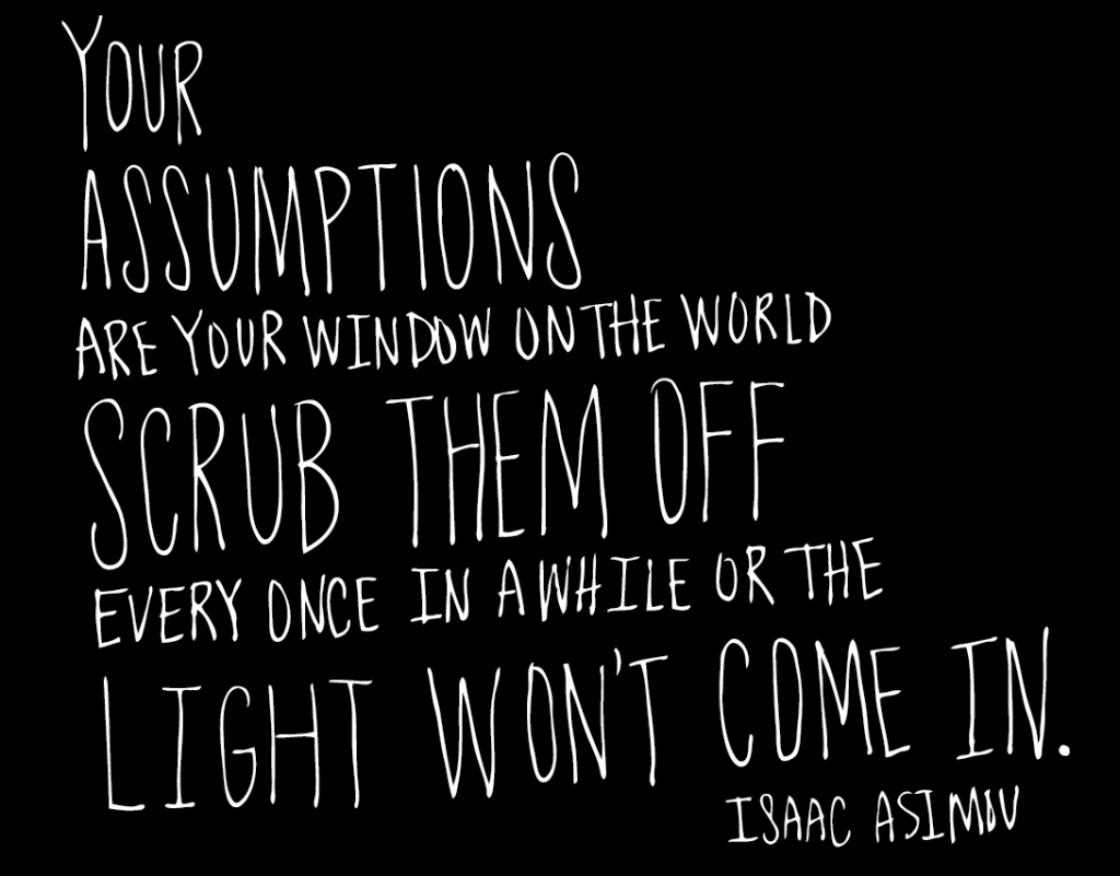 Assumptions are little hunches we follow throughout the day because we have to act upon most things without being fully informed. After all, there’s a very strong possibility that the light for the opposing traffic is red but we don’t absolutely know that. Nonetheless, we need to go when our light is green. The good news is that on the whole, our assumptions are accurate and reliable. That’s also the problem because we make so many successful assumptions we can become dull to the possibility of being wrong.