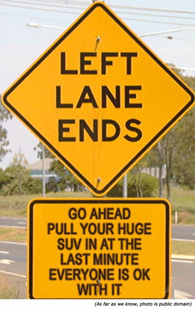 I was traveling recently on I-85 south and there were a couple of places where construction was taking place. The sign was pretty clear, Left Lane Ends—1 Mile. Or at least, I thought it was clear. At both places though, the left lane remained full of cars.