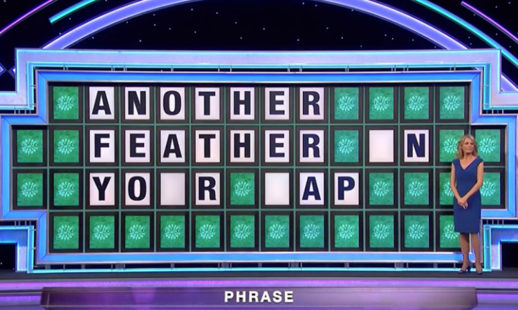 Last week on Wheel of Fortune, the puzzle was ANOTHER FEATHER IN YOUR CAP. All of the letters were revealed except for the “I” in IN, the “U” in YOUR, and the “C” in CAP. It took six more guesses before someone solved the puzzle.