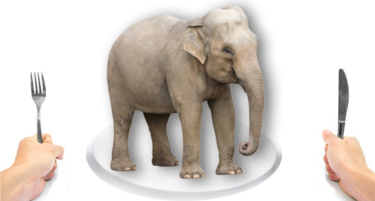 Do you remember the riddle, “How do you eat an elephant?” In case you don’t, the answer is, “One bite at a time.” Now I’ve never heard of anyone actually eating elephant, but that’s not really the point of the riddle—it’s aimed at helping us see that the way to tackle any big, daunting project is by breaking it down into smaller parts. Our oldest daughter had a teacher in elementary school who put it this way, “Yard by yard, life is hard; inch by inch, life’s a cinch.”