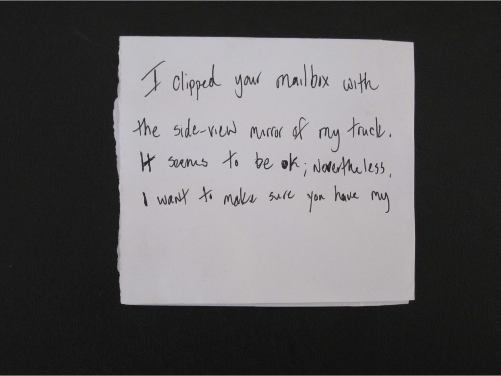 I only know this because when I stepped out of our house to return to the office after lunch, there was a truck parked in front of mine. In it was a man who looked to be in his early thirties. He was writing a note he later handed to me. The note said this: