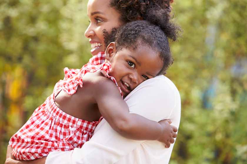 African American mother embracing with baby daughter