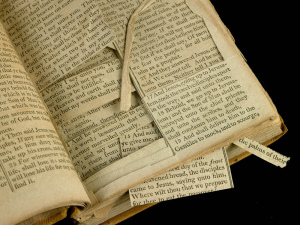 Jefferson Bible Source books open to cut-up pages to show the missing pieces